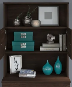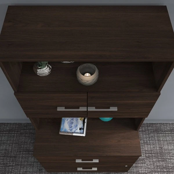 With its combination of open and closed storage, the Bush Business Furniture Office 500 Bookcase Hutch is a perfect way to keep any workspace in order while showcasing the style and personality of today's professional. This 36W Hutch attaches to the coordinating 36W 2 Drawer Lateral File Cabinet or 36W Storage Cabinet with Doors (sold separately) for a complete organization solution. Two open shelves offer plenty of space to brighten up the room with your favorite books, pictures, awards and decorations. A small cabinet conceals unsightly supplies and reference materials while keeping them easily accessible when you need them. Each shelf supports up to 50 pounds, so you can store and display larger items with confidence. Your choice of Black Walnut, Sand Oak, Modern Hickory and Storm Gray finishes with Light Silver hardware make it easy to find the right look for any professional environment. This durable bookshelf Hutch is tested to meet ANSI/BIFMA quality standards for safety and performance. See the full collection for coordinating items available.