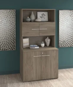 With its combination of open and closed storage, the Bush Business Furniture Office 500 Bookcase Hutch is a perfect way to keep any workspace in order while showcasing the style and personality of today's professional. This 36W Hutch attaches to the coordinating 36W 2 Drawer Lateral File Cabinet or 36W Storage Cabinet with Doors (sold separately) for a complete organization solution. Two open shelves offer plenty of space to brighten up the room with your favorite books, pictures, awards and decorations. A small cabinet conceals unsightly supplies and reference materials while keeping them easily accessible when you need them. Each shelf supports up to 50 pounds, so you can store and display larger items with confidence. Your choice of Black Walnut, Sand Oak, Modern Hickory and Storm Gray finishes with Light Silver hardware make it easy to find the right look for any professional environment. This durable bookshelf Hutch is tested to meet ANSI/BIFMA quality standards for safety and performance. See the full collection for coordinating items available.