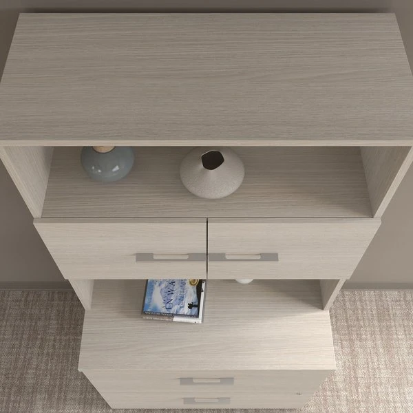 With its combination of open and closed storage, the Bush Business Furniture Office 500 Bookcase Hutch is a perfect way to keep any workspace in order while showcasing the style and personality of today's professional. This 36W Hutch attaches to the coordinating 36W 2 Drawer Lateral File Cabinet or 36W Storage Cabinet with Doors (sold separately) for a complete organization solution. Two open shelves offer plenty of space to brighten up the room with your favorite books, pictures, awards and decorations. A small cabinet conceals unsightly supplies and reference materials while keeping them easily accessible when you need them. Each shelf supports up to 50 pounds, so you can store and display larger items with confidence. Your choice of Black Walnut, Sand Oak, Modern Hickory and Storm Gray finishes with Light Silver hardware make it easy to find the right look for any professional environment. This durable bookshelf Hutch is tested to meet ANSI/BIFMA quality standards for safety and performance. See the full collection for coordinating items available.