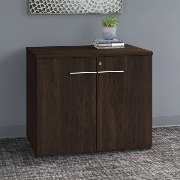 The Bush Business Furniture Office 500 Storage Cabinet with Doors offers an efficient and secure way to organize materials in any workspace. With one fixed shelf and one adjustable shelf that support up to 50 pounds each, this 2 Door Cabinet is an ideal solution for storing office supplies and reference materials of various sizes. Doors feature smooth Euro-style hinges for easy access to contents and can be locked to protect valuable items. Office 500 provides a variety of customizable workspace solutions that are perfect for showcasing the style and personality of today's professionals. A single accent cabinet accepts the coordinating 36W Bookcase Hutch while two positioned side by side can accept a 72W Desk Hutch for increased storage and display capacity (Hutches sold separately). Your choice of Black Walnut, Sand Oak, Modern Hickory and Storm Gray finishes with Light Silver hardware make it easy to find the right look for any office environment. This locking Storage Cabinet is tested to meet ANSI/BIFMA quality standards for safety and performance. See the full collection for coordinating items available.