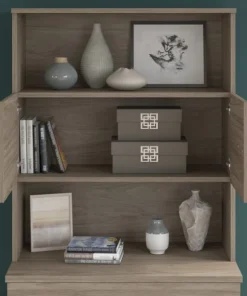 The Bush Business Furniture Office 500 36W Tall Storage Cabinet with Doors and Shelves is perfect for maintaining an organized workspace while showcasing the style and personality of today's professional. Keep reference materials and supplies in the bottom cabinet, which contains one fixed shelf and one adjustable shelf to accommodate items of various sizes. The lower doors can be locked to protect valuable equipment. Two open shelves offer plenty of space to store books or brighten up the room with your favorite pictures, awards and decorations. The upper cabinet conceals smaller reference materials along with the items you want kept in order but out of sight. Each of the Bookcase Storage Cabinet's shelves supports up to 50 pounds, so organizing larger items is no problem. Doors feature smooth Euro-style hinges for easy access to contents. Your choice of Black Walnut, Sand Oak, Modern Hickory and Storm Gray finishes with Light Silver hardware make it easy to find the perfect look for any workspace. This office cabinet is tested to meet ANSI/BIFMA quality standards for safety and performance. See the full collection for coordinating items available.