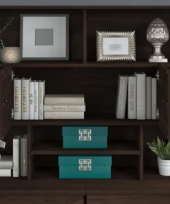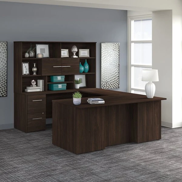With its combination of open and closed storage, the Bush Business Furniture Office 500 Desk Hutch is a perfect way to keep any workspace in order while showcasing the style and personality of today's professional. This 72W Hutch attaches to the coordinating 72W x 24D Credenza Desk, two 36W 2 Drawer Lateral File Cabinets or two 36W Storage Cabinets (coordinating items sold separately). Open cubby spaces on the right and left offer plenty of room to display pictures, professional achievements and other decorations while the large top shelves are ideal for organizing a collection of books. The center of the Hutch features a small storage cabinet that keeps office supplies and reference materials out of sight but easily accessible. Below the cabinet is an adjustable shelf that can be used to store work-in-progress or small electronic devices like a laptop or tablet. Your choice of Black Walnut, Sand Oak, Modern Hickory and Storm Gray finishes with Light Silver hardware make it easy to find the right look for any office environment. This durable Desk Hutch is tested to meet ANSI/BIFMA quality standards for safety and performance. See the full collection for coordinating items available.