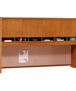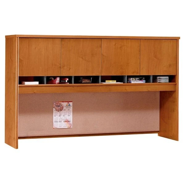 Create a complete workstation by adding the Bush Business Furniture Series C 72W 4 Door Hutch in Natural Cherry for classic styling with clean lines and extended modesty panels. Create the perfect combination of form and function by mounting the Hutch to the 72W Desk or Credenza Shell, Corner Modules and combined Lateral Files. Constructed with 100% thermally fused laminate for durability and superior resistance to scratches and stains. The Hutch includes six work-in-progress shelves and a closed storage compartments with self-closing, Euro-style hinges for a soft close. Wire management grommets provide pathways to keep plugs and cables under control. Enjoy a fully finished back panel with a fabric covered tack board to create additional space for organizational notes and calendars, plus it accepts two Task Lights to enhance illumination. Solid construction meets ANSI/BIFMA test standards in place at time of manufacture.