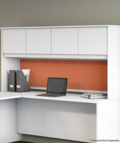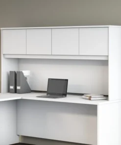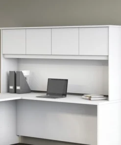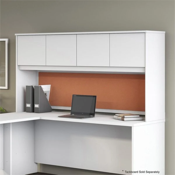 Organize your office with the durable, attractive and functional Bush Business Furniture Studio C 72W Hutch. With 4 doors featuring self-closing Euro-style hinges, the Hutch conveniently stores office supplies, books and more to keep your Studio C desk organized. The Hutch mounts to the 72W Office Desk or Credenza Desk (sold separately) and provides a fully finished back panel. Add a coordinating Tackboard (sold separately) to keep your important notes within sight while you work. The thermally fused laminate construction resists scratches, stains and damage throughout your 40-plus hour week. The classic Hutch design meets contemporary White and Storm Gray finish options to fit the needs of the modern workspace. The 4 door hutch comes meets ANSI/BIFMA quality test standards. See the full collection for coordinating items available to make your office your own with Studio C.