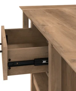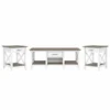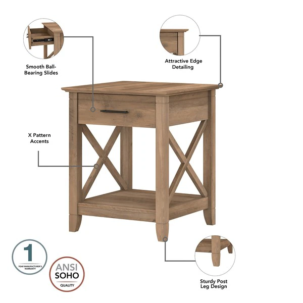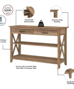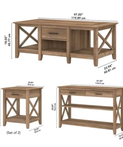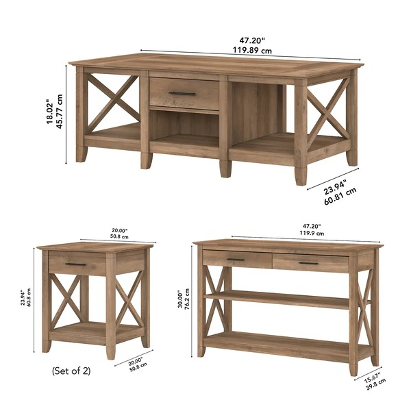 The Bush Furniture Key West Coffee Table with Console Table and Set of 2 End Tables is a perfect way to bring the feel of a coastal retreat right to your living room. Highlighted by unique X pattern accents and your choice of several casual finishes, this table set is a natural fit in homes that embrace cottage and farmhouse styling. Each side of the low Coffee Table features a box drawer above an open cubby space for organizing books, magazines and other miscellaneous items. Larger compartments to the right and left offer plenty of room for decorations or additional storage. The side tables also include a drawer for small accessories like TV remotes, writing utensils and notepads while the surface easily supports a lamp, plant or pictures. The versatile Console Table adds two drawers for household supplies and two shelves for even more open storage and display capacity. The bottom shelf is fixed for stability, and the upper shelf can be raised or lowered to accommodate materials and decor of various sizes. This living room table set has been rigorously tested to meet Bush Furniture's standards for safety, performance and durability and is backed by a . Browse the full Key West Collection for home furnishings with easy going style, including a Tall TV Stand to complete your living room furniture set (coordinating items sold separately).