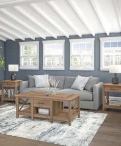 The Bush Furniture Key West Coffee Table with Set of 2 End Tables is a perfect way to bring the feel of a coastal retreat right to your living room. Highlighted by unique X pattern accents and your choice of several casual finishes, this table set is a natural fit in homes that embrace cottage and farmhouse styling. Each side of the low Coffee Table features a box drawer above an open cubby space for organizing books, magazines and other household items. Larger compartments on the right and left offer plenty of room for decorations or additional storage. The side tables also include a small drawer for TV remotes, writing utensils and more. A lower shelf provides even more storage and display capacity while the surface easily supports a lamp, plant or pictures. This living room table set has been rigorously tested to meet Bush Furniture's standards for safety, performance and durability and is backed by a . Browse the full Key West Collection for home furnishings with easy going style, including a Console Table with Storage and Tall TV Stand for a complete living room furniture set (coordinating items sold separately).