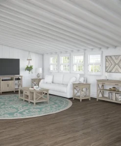 The Bush Furniture Key West Console Table with Drawers and Shelves is a perfect way to bring the feel of a coastal retreat to any living space. Unique X pattern accents on the side panels and your choice of several casual finishes present a look that works well in homes that embrace cottage and farmhouse styling. Box drawers organize miscellaneous household supplies while two shelves offer plenty of room for books, decorations and more. The bottom shelf is fixed for stability, and the upper shelf can be raised or lowered to accommodate items of various sizes. The surface is an ideal place to brighten up the room with personal touches like plants, pictures and other decor. Use the versatile 47W x 16D x 30H sofa table on its own or add the matching Coffee Table, End Tables and 60W TV Stand to create a complete living room furniture set (coordinating items sold separately). This Console Table with Storage has been rigorously tested to meet Bush Furniture's standards for safety, performance and durability and is backed by a . Browse the full Key West Collection for home furnishings with easy going style.