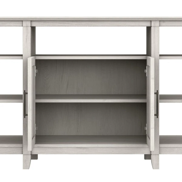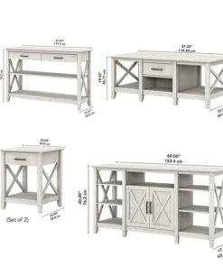 The Bush Furniture Key West Tall TV Stand with Coffee Table and Set of 2 End Tables is a perfect way to bring the feel of a coastal retreat right to your living room. Highlighted by unique X pattern accents and your choice of several casual finishes, this furniture set is a natural fit in homes that embrace cottage and farmhouse styling. Get together for movie night or catch up on your favorite show around an entertainment center that supports up to a 65 inch television and/or 75 pounds. An upper shelf with a cable management cut out provides an ideal place to keep your DVD player or video game console. A closed cabinet and open storage areas on either side offer more than enough space for movies, games and other media essentials. Each side of the low Coffee Table features a box drawer above an open cubby for organizing books, magazines and other miscellaneous items. Larger compartments to the right and left add plenty of room for decorations or additional storage. The side tables also include a drawer for small accessories like TV remotes, writing utensils and notepads while the surface easily supports a lamp, plant or pictures. This living room table set has been rigorously tested to meet Bush Furniture's standards for safety, performance and durability and is backed by a . Browse the full Key West Collection for home furnishings with easy going style.