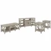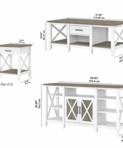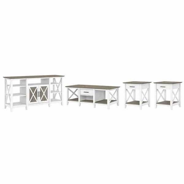 The Bush Furniture Key West Tall TV Stand with Coffee Table and Set of 2 End Tables is a perfect way to bring the feel of a coastal retreat right to your living room. Highlighted by unique X pattern accents and your choice of several casual finishes, this furniture set is a natural fit in homes that embrace cottage and farmhouse styling. Get together for movie night or catch up on your favorite show around an entertainment center that supports up to a 65 inch television and/or 75 pounds. An upper shelf with a cable management cut out provides an ideal place to keep your DVD player or video game console. A closed cabinet and open storage areas on either side offer more than enough space for movies, games and other media essentials. Each side of the low Coffee Table features a box drawer above an open cubby for organizing books, magazines and other miscellaneous items. Larger compartments to the right and left add plenty of room for decorations or additional storage. The side tables also include a drawer for small accessories like TV remotes, writing utensils and notepads while the surface easily supports a lamp, plant or pictures. This living room table set has been rigorously tested to meet Bush Furniture's standards for safety, performance and durability and is backed by a . Browse the full Key West Collection for home furnishings with easy going style.