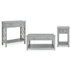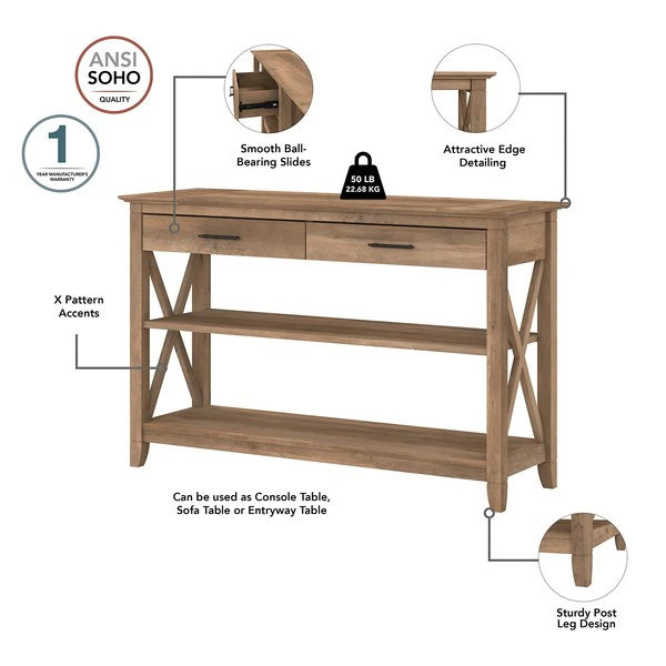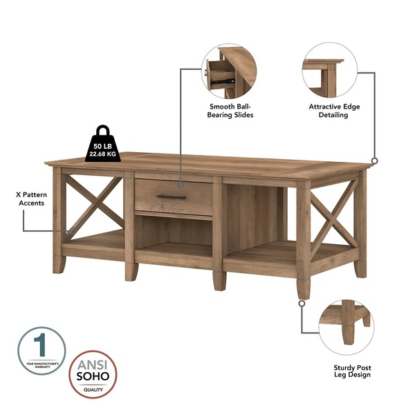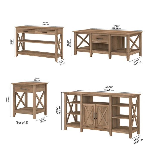 The Bush Furniture Key West Tall TV Stand with Coffee Table, Console Table and Set of 2 End Tables is a perfect way to bring the feel of a coastal retreat right to your living room. Highlighted by X pattern accents and your choice of several casual finishes, this furniture set is a natural fit in homes that embrace cottage and farmhouse styling. Get together for movie night or catch up on your favorite show around an entertainment center that supports up to a 65 inch TV and/or 75 pounds. An upper shelf with cable management provides a place for components while the cabinet and open storage areas accommodate movies, video games and other media. Each side of the low Coffee Table features a box drawer above an open cubby for organizing books and magazines. Large compartments to the right and left add plenty of space for decorations or additional storage. The side tables also include a drawer for small accessories like TV remotes, writing utensils and notepads while the surface easily supports a lamp, plant or pictures. The Console Table has two drawers for household supplies and two shelves for even more open storage and display capacity. The bottom shelf is fixed for stability and the upper shelf can be adjusted to accept materials and decor of various sizes. This living room table set has been rigorously tested to meet Bush Furniture's standards for safety, performance and durability and is backed by a .