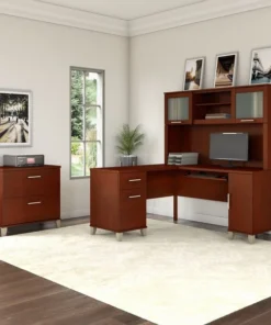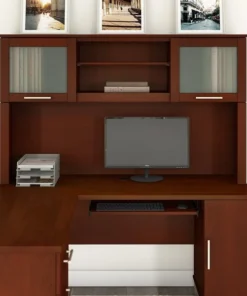 The Bush Furniture Somerset 60W Hutch offers the storage and display capacity you need to complete your beautiful and functional home office. The Hutch mounts securely on either side of the coordinating 60W L Shaped Desk (sold separately) for increased storage capacity and a finished appearance. Storage options include a large open compartment that is perfect for books, binders or decorations as well as a pair of frosted glass doors that provide concealed storage to eliminate visual clutter. An adjustable shelf makes it easy to store and display items of various sizes. Transitional styling includes contemporary metal hardware and your choice of several attractive finish options for an alluring home office design that works with your existing decor. This 60-inch Desk Hutch is tested to meet ANSI/SOHO quality standards for safety and performance. See the full line of coordinating items from the Somerset Collection to expand your home office in style.