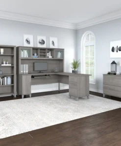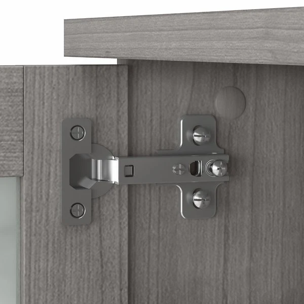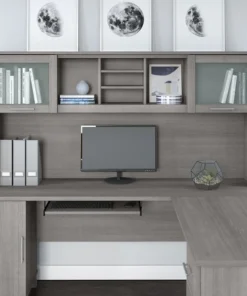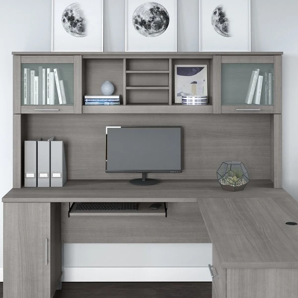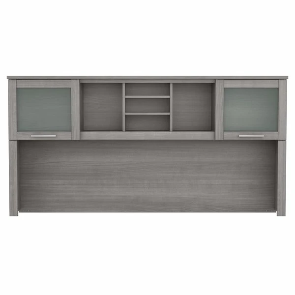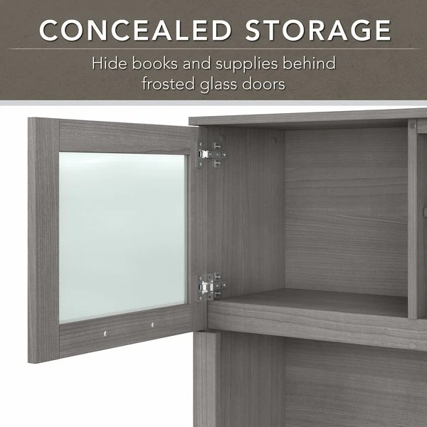 The Bush Furniture Somerset 72W Hutch offers the storage and display capacity you need to complete your beautiful and functional home office. The Hutch mounts securely on either side of the coordinating L Shaped Desk or 72W Office Desk with Drawers (both sold separately) for a customizable workspace solution. Storage options include large open compartments that are perfect for books, binders or decorations and two shelves to hold work-in-progress. A pair of frosted glass doors provides concealed storage to eliminate visual clutter. Transitional styling includes contemporary metal hardware and your choice of several attractive finish options for an alluring home office design that works with your existing decor. This 72-inch Desk Hutch is tested to meet ANSI/SOHO quality standards for safety and performance. See the full line of coordinating items from the Somerset Collection to expand your home office in style.