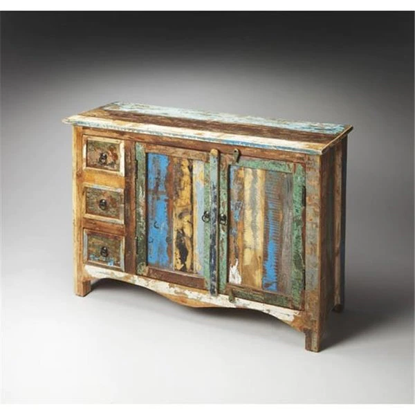 TCrafted from assorted recycled wood solids and hand painted with a sense of childlike Crayola abandon this compelling Sideboard serves up the exuberant cacophony of a soaring spirit. The piece boasts abundant storage behind two doors and inside three drawers each opened by complementary black iron finished hardware.FeaturesType – SideboardFinish – ArtifactsDimension – 15.75 D x 43.5 W x 33 H in.