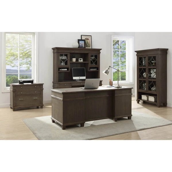 Constructed of solid Pine and Ash veneers, Carson Office fits well in any home or executive office. Weathered dove finish accentuates the natural open grain, creating a casual yet elegant look. Mottled antique finish hardware and four point diamond metal accents enhance the Carson collection.