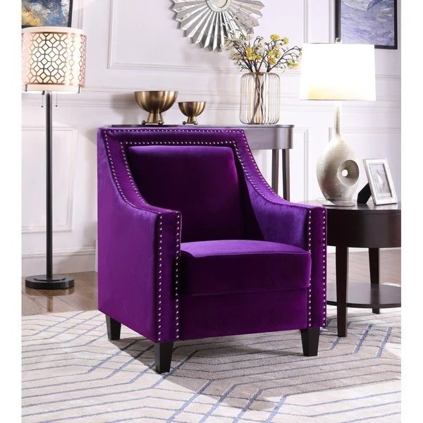 A modern take on traditional design, the accent chair is a statement – making piece of beautiful design. Rich velvet upholstery, swoop arm look, nickel-finished nail head trim and tapered espresso finished wood legs are sure to grab the attention of anyone in the room. Place two together to create a conversation area or pair with the sofa for a cohesive look. Suited for both traditional and contemporary design environments. FeaturesPremium quality velvet upholsteryTimeless swoop arm lookClean lines and softness create a look that fits a traditional or contemporary interior decorLuxurious plush multi density foam cushions to relax in comfort and styleRich hued with nail head trim and clean linesBuilt to last with premium fabrics, materials, and expert craftsmanshipIncludes1 Accent ChairCare InstructionSpot clean onlySpecificationsColor: PurpleMaterials: Velvet fabric upholstery, multi density foam seating, wood legsDesign: Modern ContemporaryDimension: 36.6" H x 32.3" W x 30.6" LWeight: 54.8 lbs