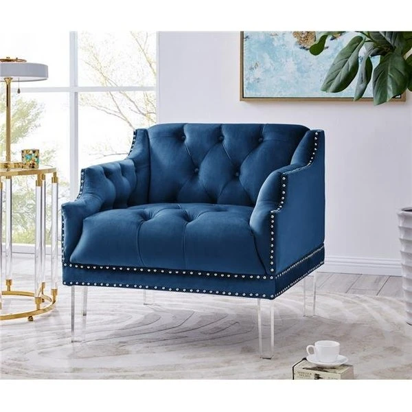 A modern take on a traditional design. the Eva club chair is an accent piece of beautiful design. Rich velvet is tufted on the inside of the frame. a beautiful design detail that can be seen from any angle in a room. The love seat is accented with double rows of nickel-finished nailheads and sits atop stylish acrylic legs. Place two together to create a conversation area or pair with the Eva sofa and/or love seat. Suited for both traditional and contemporary design environments. The digital images we display have the most accurate color possible. However. due to differences in computer monitors. we cannot be responsible for variations in color between the actual product and your screen. FeaturesLuxurious plush multi density cushions to relax in comfort and stylePlace two together to create a conversation areaPair with the Eva love seat and/or sofa for a cohesive lookBuilt to last with premium fabrics. materials. and expert craftsmanshipIncludes:1 Eva Club ChairCare Instructions:Spot clean onlyFabric & Design:Premium quality luxurious velvet upholsteryClean lines and softness create a look that fits a traditional or contemporary interior decorSpecificationsColor: BlueMaterials: Velvet fabric. multi density foam seating. acrylic legsLength: 33.5"Width/Depth: 32.5"Height: 31.5"Seat Length: 20.5"Seat Depth: 23.5"Seat Height: 20"Leg Height: 9"Weight: 75 lbs