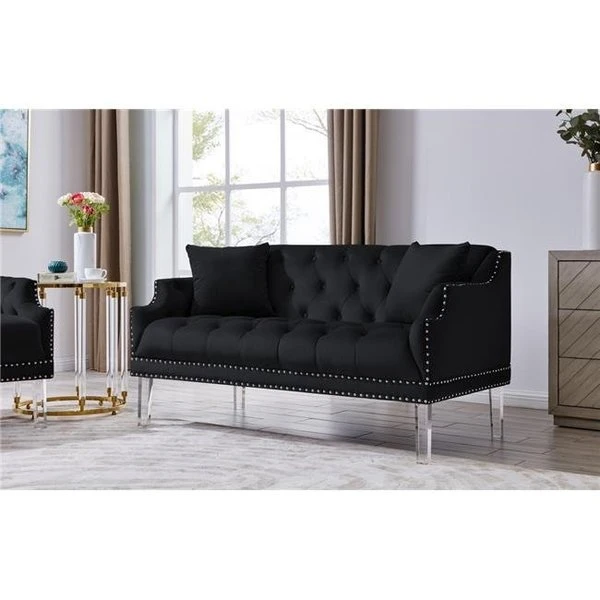 A modern take on a traditional design. the Eva love seat sofa is a statement-making piece of beautiful design. Rich velvet is tufted on the inside of the frame. a beautiful design detail that can be seen from any angle in a room. The love seat is accented with double rows of nickel-finished nailheads and sits atop stylish acrylic legs. Works great as a standalone piece and pairs beautifully with the Eva sofa and/or club chair. Suited for both traditional and contemporary design environments. The digital images we display have the most accurate color possible. However. due to differences in computer monitors. we cannot be responsible for variations in color between the actual product and your screen. FeaturesLuxurious plush multi density cushions to relax in comfort and stylePair with the Eva sofa and/or club chair for a cohesive lookBuilt to last with premium fabrics. materials. and expert craftsmanshipIncludes:1 Eva Love SeatCare Instructions:Spot clean onlyFabric & Design:Premium quality luxurious velvet upholsteryClean lines and softness create a look that fits a traditional or contemporary interior decorSpecificationsColor: BlackMaterials: Velvet fabric. multi density foam seating. acrylic legsLength: 58.5"Width/Depth: 32.5"Height: 31.5"Seat Length: 45.5"Seat Depth: 23.5"Seat Height: 20"Leg Height: 9"Weight: 119 lbs