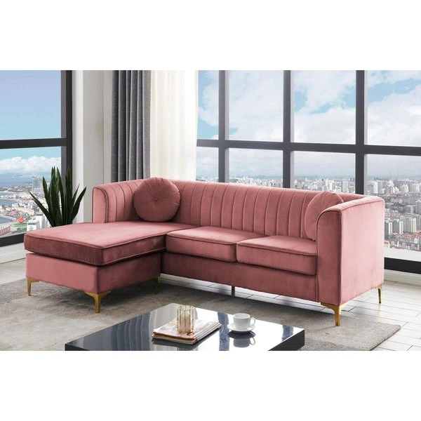 Think of the Britannia modular sectional sofa as a statement-making piece that incorporates contemporary design and boundless flexibility. The Britannia sectional consists of a sofa and a chaise that you can rearrange in a snap to meet your decor needs. Looking for an L shaped right facing chaise sectional – done. left-facing – also done. Upholstered in luxe velvet and finished with sleek gold tone solid metal Y-legs. the Britannia epitomizes style meets function. The digital images we display have the most accurate color possible. However. due to differences in computer monitors. we cannot be responsible for variations in color between the actual product and your screen. FeaturesCan be used as a left facing or right facing sectionalLuxurious plush multi density foam cushions to relax in comfort and styleBuilt to last with premium fabrics. materials. and expert craftsmanshipIncludes:1 Britannia Modular Sectional Sofa2 Decorative Pillows (16" Diameter)Care Instructions:Spot clean onlyFabric & Design:Premium quality velvet upholsteryClean. square lines create a look that fits a modern or contemporary settingSpecificationsColor: BlushMaterials: Velvet upholstery. plush multi density foam seating. metal legsLength (Overall): 88"Width/Depth (Chaise Side): 60"Width/Depth (Sofa Side): 33"Height: 30.5"Seat Length: 74.5"Seat Depth (Chaise Side): 50"Seat Depth (Sofa Side): 23"Seat Height: 19"Leg Height: 6"Weight: 158.73 lbs