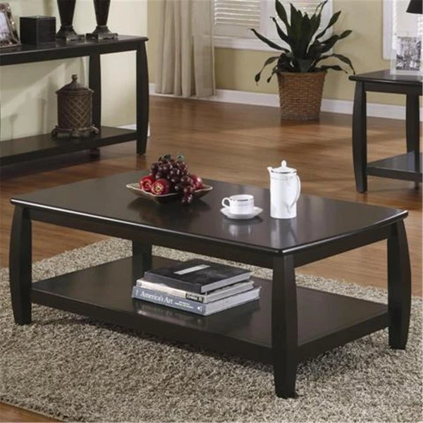 The casual contemporary designs of this cocktail table will offer a stylish focal point in your living room. Unique bowed legs and a rich cappuccino finish add to sleek features. while one large bottom shelf provides room for books. TV remote controls. or even blankets. Arrange with the coordinating end table and sofa table for a harmonious look in your living room. family room. or den.Item and Dimensions.Width (side to side) 47.5" W.Height (bottom to top) 18" H.Depth/Length (front to back) 26" D.Style Contemporary.Case Detail Smooth. rounded table top edeges and bowed legs.Storage and Features.Storage One Large Bottom Shelf.Shelves and Doors 1 Shelf.Description: Top Finished wood tops.