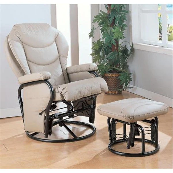 The look of leather for less makes this glider rocker with ottoman a must for any – or every – room in your home. A uniquely shaped back is accentuated with accent stitching and paired with a rounded front seat for supportive comfort. A matching ottoman offers cushioned support for your legs and invites you to put up your feet and stay awhile. Pillow armrests top the metal base. which features glide and recline mechanisms for total relaxation. Your choice of black or bone leatherette lets you dress this recliner with ottoman set up as much or as little as you like for a beautiful addition to your den or living room decor.Ottoman: 19.5"L x 15"W x 15.25"H.Width (side to side): 27.75" W.Height (bottom to top): 42.75" H.Depth/Length (front to back): 36.5" D.Fabric Content: Leatherette.Fabric Pattern: Solid.Style: Casual.Arm Type: Pillow Arm.Arm: Pillow Arm Anchored Atop Steel Frame.Seat Back: Uniquely Shaped Seat Back with Leatherette Upholstery.Seat: Leatherette Seat Cushion with Rounded Front.Leg or Skirt: Round Bases.Reclining Release: Exterior Handle.Footrest Operation: Round Base Ottoman with Glide Function.Recliner Options Available: Swivel Glider Recliner.