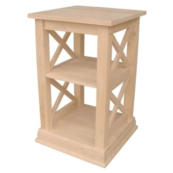This beautiful end table matches the rest of the Hampton X sided collection. The shelf at the bottom is great to place a basket for all the items you wish to store but not see. This table has one removable shelf and is the perfect size to place next to your recliner. It is made of solid parawood and contains no veneers.Measurements: 16" W x 16" D x 26" H.