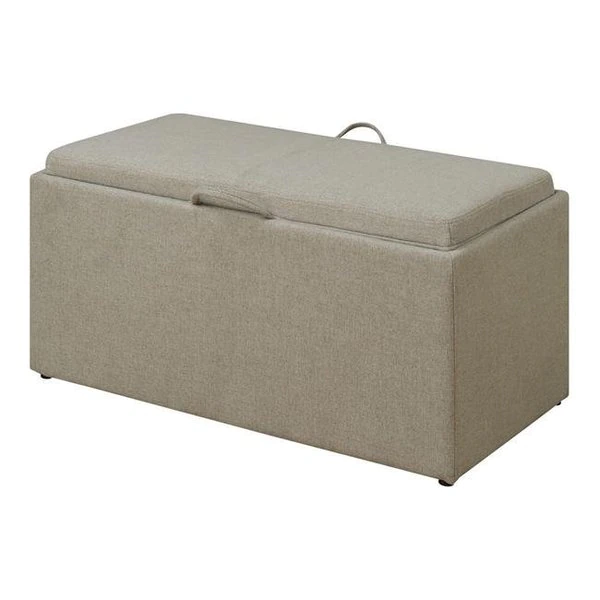 Loads of storage space with seating. Remove the top to reveal 2 side ottomans. Turn the top over to find built in hardwood serving tray with cut out handles.Fully AssembledStorage Bench with Two Side OttomansBuilt in Hardwood TraySoft Fabric SurfaceWill Provide Years of enjoyment SpecificationsColor: Soft Beige FabricDimension: 18.25" H x 35" W x 17.75" DWeight: 26 lbs