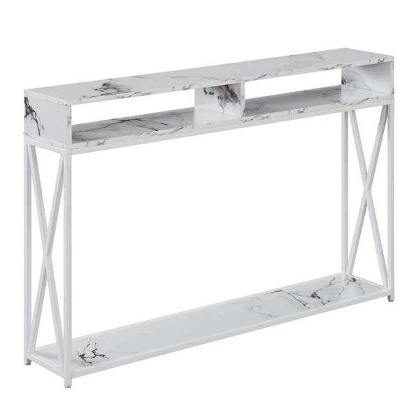 The Tucson Deluxe Console Table with Shelf by Convenience Concepts makes for the perfect addition to any home. This console table features two open compartments that offer space to store books. collectibles. and decor. Also including an additional bottom shelf. storage and display options are endless with this modern piece. This unit is supported by a sturdy powder-coated metal frame and the shelving is crafted from MDF and melamine veneer. SpecificationsColor: WhiteDimension: 47.25 x 9 x 30.5 in.Weight: 35 lbs