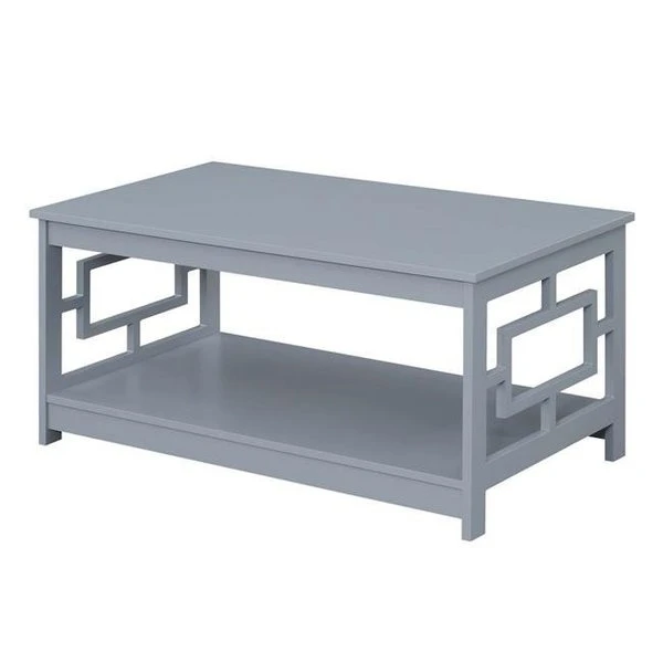 Update your home with this beautifully crafted Town Square Coffee Table with Shelf by Convenience Concepts. This simple yet eye-catching coffee table showcases a symmetrical Asian-inspired design with its unique square side panels. The large spacious tabletop and the open-concept bottom shelf provide the perfect space to display decor and store entertainment essentials. Crafted from MDF and finished with non-lead-based paint. this transitional table is built to last.FeaturesTwo Tiers of Spacious ShelvingCrafted from MDF and Non-Lead-Based PaintBeautiful matte gray wood finishSpecificationsFinish: GrayCollection: Town SquareDimensions: 39.25" L x 21.75" W x 18" HWeight: 42 lbs