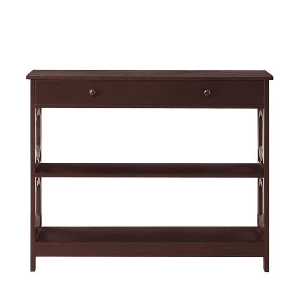 Give your home a handsome makeover with the Omega 1 Drawer Console Table. Featuring a bottom and middle shelf as well as a drawer for concealed storage you can display collectibles and hide away unsightly accessories. The geometric pattern creates a modern appeal with clean lines. Crafted to last. the Omega 1 Drawer Console Table will quickly become a staple in your home. Also In multiple finishes it will easily complement any decor. Look for other items from the Omega Collection for the complete look. separately. Omega CollectionGeometric Side Design Drawer For Concealed StorageQuick and Easy Set UpIn Multiple Finishes SpecificationsColor: EspressoDimension: 31.5" H x 39.5" W x 12" DWeight: 42 lbs