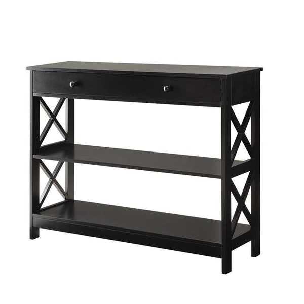 Give your home a handsome makeover with the Oxford 1 Drawer Console Table. Featuring a bottom and middle shelf as well as a drawer for concealed storage you can display collectibles and hide away unsightly accessories. The X pattern creates a modern appeal with clean lines. Crafted to last the Oxford 1 Drawer Console Table will quickly become a staple in your homeFeaturesOxford CollectionX PatternDrawer For Concealed StorageQuick and Easy Set UpColor – BlackDimension – 39.25 x 11.75 x 31.5 in.