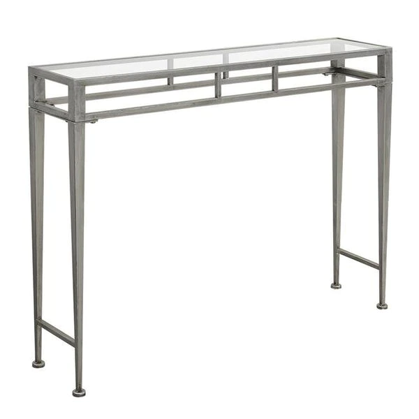 FeaturesThe sleek styling of the gold Coast Julia Console table is sure to grab the attention of your guests.This piece features a clear tempered glass table top for you to display your collectibles or place other belongings.The contemporary iron frame provides plenty of ability with its double apron top. tapered straight legs and bun feet.The Julia Console Table's simple design will complement any dncorTempered Glass Table TopColor – SilverDimension – 42 x 9 x 30.25 in.