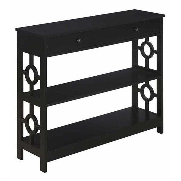 Add a noteworthy design to your living room ensemble today with the Ring 1 Drawer Console Table by Convenience Concepts. This contemporary piece showcases a well thought out construction that combines a clean lined silhouette and two circles that adorn each of the side frames. With an ample tabletop;; a drawer;; and two bottom shelves;; you will never run out of storage or display space. Feel the freedom of exhibiting all your most beloved collections or books and use the drawer to keep those unsightly essentials. The metal drawer glides help to smoothly open and close the drawer when needed. This accent table was carefully crafted to become a staple in your home. The drawer and shelves are fashioned from particle board that is finished with both non lead based paint and melamine;; making them durable and easy to clean. The side frames and legs were made from MDF that is finished with a non lead based paint;; making them both sturdy and long lasting. With such a vogue and versatile look;; this 3 tier unit is ideal for your hallway;; entryway and even for your home office. Bring home today and enjoy its simple and worthy assembly. FeaturesPart of the Ring Collection by Convenience ConceptsRefresh your home decor with this contemporary styleParticle board/MDF/Melamine/Non-lead based paintSimple and fast assembly that is worth every step!Assembly RequiredSpecificationsFinish: BlackDimension: 40" L x 12" W x 31.75" HWeight: 47 lbs