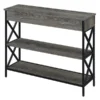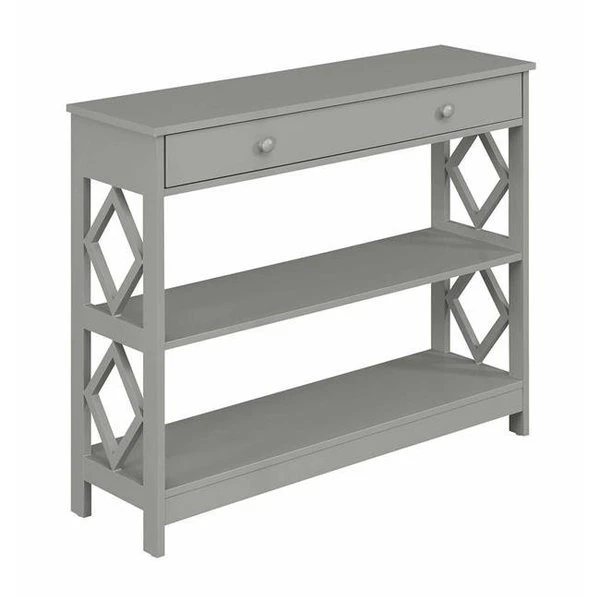 With room to spare. the Diamond 1 Drawer Console Table by Convenience Concepts is the must-have piece to optimize both storage and display space in your home. This three-tier unit does not fall short on style. its noteworthy construction was designed with the latest home fashion in mind. The clean-line silhouette combined with two beautiful diamond cut-outs that adorn each of the side frames. creates a chic art piece to upgrade any home decor. The tabletop and bottom shelves offer the ideal display stage for all your favorite collectibles or books. The ample drawer with metal glides offers enough room to keep your living room essentials. This item was crafted with versatility and longevity in mind. Both the tabletop and shelves were fashioned from particle board that is finished with both melamine and non-lead based paint. making them easy to clean. The frames and legs were made from MDF that is finished with non-lead based paint. making them sturdy. Its versatile design gives you the freedom to place anywhere in your house. from your entryway to your den. Bring home today and enjoy its simple assembly that is worth every step! Pair with the Diamond End Table and Diamond Coffee Table by Convenience Concepts and complete the Diamond Collection look. SpecificationsColor: Gray GrayDimension: 40" L x 12" W x 31.75" HWeight: 47 lbs