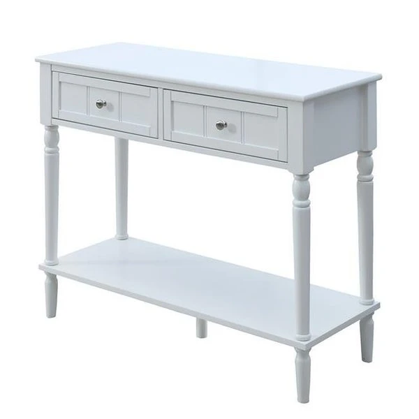 FeaturesThe French Country Two Drawer Hall Table is the perfect combination of sophistication and elegance.Featuring 2 drawers for concealed storage and an open bottom shelf. you can hide away small odds and ends and display books to baskets.The beveled table top edge. carved drawer. stainless steel knobs and sculpted turned legs the style that you were looking to add to your home.Bottom Shelf for Additional Storage and DisplayColor – WhiteDimension – 35.75 x 13.75 x 29.5 in.
