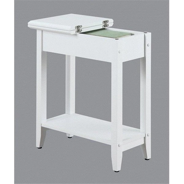 Upgrade your space with the American Heritage Flip Top End Table. This narrow silhouette was crafted with style and functionality in mind. Featuring a classic straight leg and a hidden storage compartment. Flip open the table top where you can hide away anything from remote controls to phone or tablet chargers and any other unsightly accessories. This piece is also available in multiple finishes that will easily complement any new or existing decor. Narrow SilhouetteHinged Tabletop Offers Concealed StorageAvailable in Multiple FinishesBottom Shelf StorageEasy Assembly