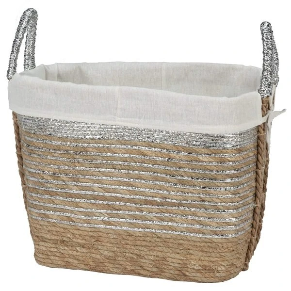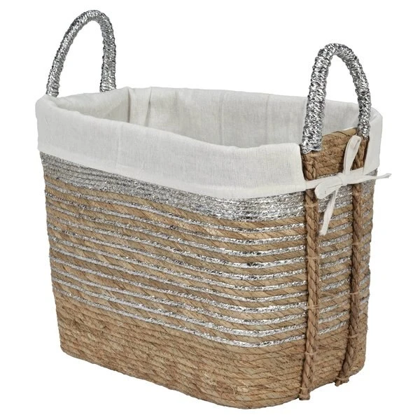 Storage baskets crafted from straw. Traditional charming look with hint of metallic accent on the body and handles. Tapered oval frame lined with a removable, machine washable polyester fabric liner. Spot clean. 17.5 x 11.5 x 17"H Height includes 4" handes.