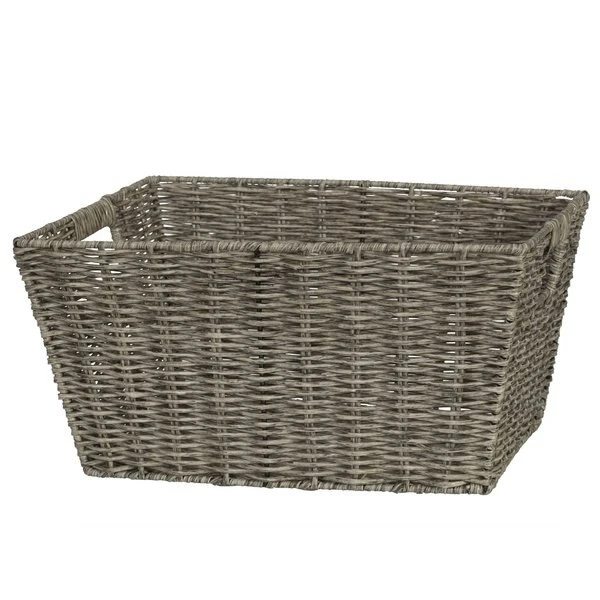 Decorative and functional storage baskets constructed of hand-woven polyrattan that is durable, wipable and water resistant. Tone on tone look is transitional and blends wth your bath and home décor. Can be used in most rooms of the home. Wipe clean. Cut out handles for easy transport. 15.75 x 12 x 8"H.