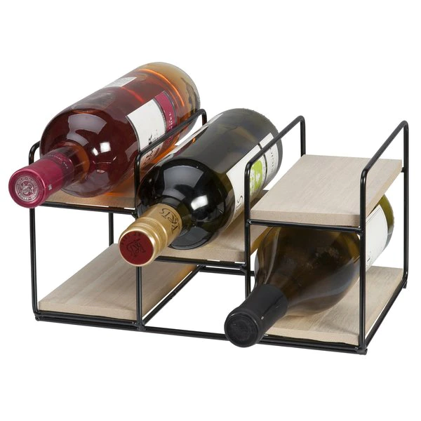 Wine rack is a clean, sleek dimensional design using sturdy metal wire with a durable powder coat black finish and natural color wood shelves. No assembly required. 7.0 x 10.8 x 5.8"H19.6 x 4.75D x 6.4"H