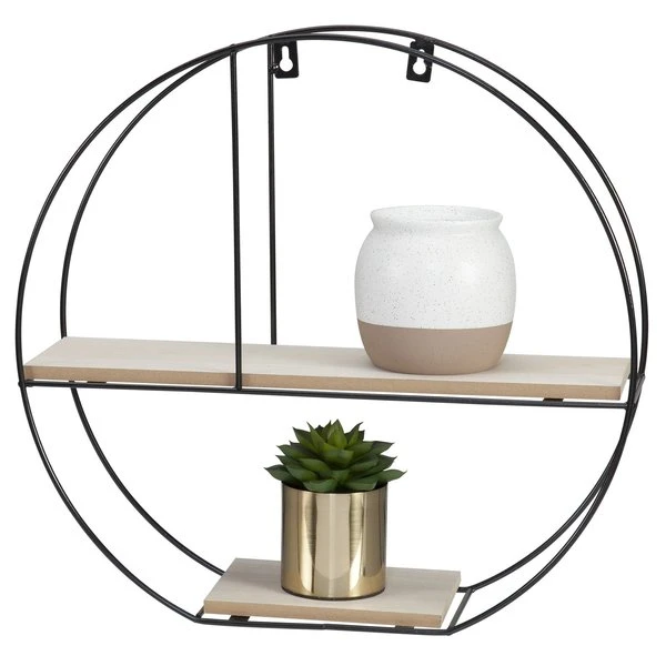 Round wall organizer with 2 shelves is a clean, sleek dimensional design using sturdy metal wire with a durable powder coat black finish and natural color wood shelves. 15.75 x 4.75 x 15.75"H. No assembly required.