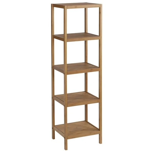Five shelf tower. Exquisitely detailed and and crafted of environmentally sound Bamboo material. Decorative and functional storage and organization for any room in the home. Our natural Eco Styles Home Collection is made of bamboo with an innovative tongue and groove look and design. Transitional series covers most wanted items in storage for bath, bedroom, den, kitchen, laundry room, home office….. . Easy care. Wipe clean with soft damp cloth. 14.5" x 13" x 53.5"H