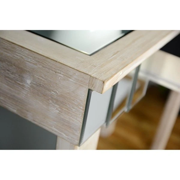 Catherine 1-Drawer Mirrored Console Table The art deco inspired Catherine Console table is constructed straight tapered legs. and gradually sized beveled mirrors with the largest piece in the center. and symmetrically decreasing pieces placed to the sides. the top also has a beveled mirror inset. The front central 5 pieces are a hidden drawer front that opens easily with black metal glides. SpecificationsColor: White WashedMaterial: MDF. Wood and Mirrored GlassWeight: 57 lbs