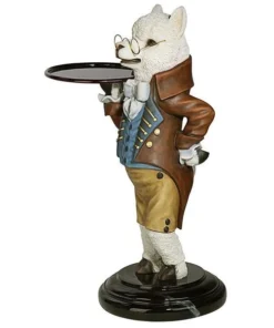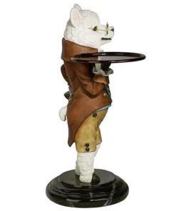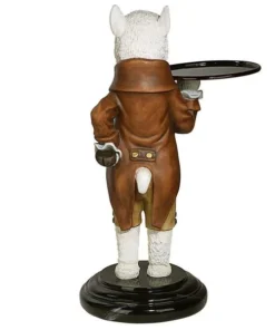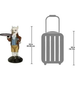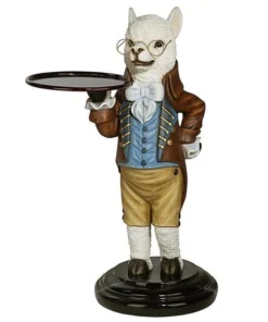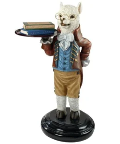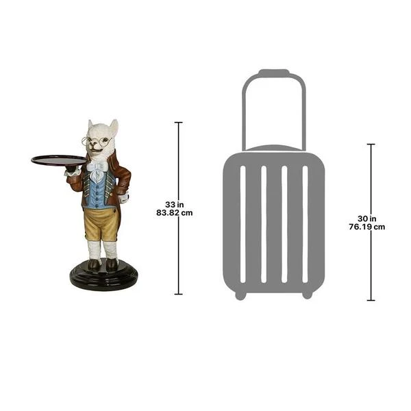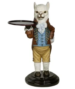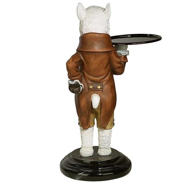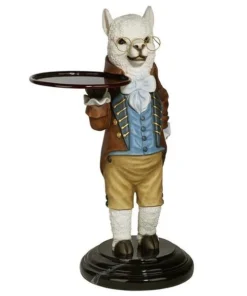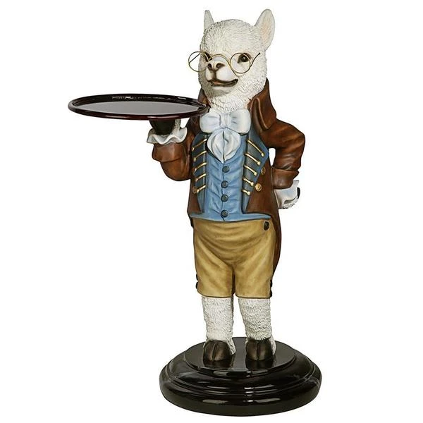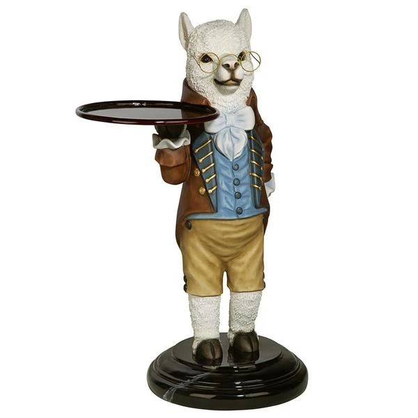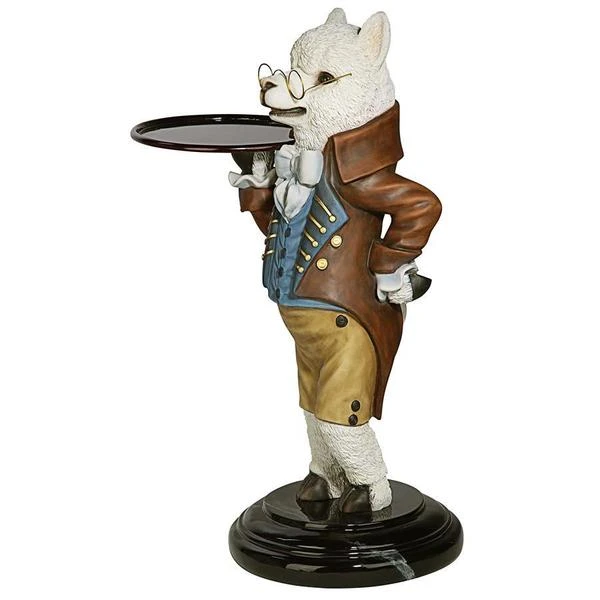 Though he won t pull the fleece over anyone s eyes, our artistic alpaca is adorably at your service with outstretched arm and all the Victorian airs he can muster! Disarmingly dapper in a four-button vest and a coat with gold soutache braid, this Design Toscano-exclusive bottle butler is quite on trend as the animal chief of staff. Cast in quality designer resin and hand painted to highlight details from his round spectacles to pert ears, Alfred is always at the call in an entryway or near a favorite reading chair. Simple assembly required. 201⁄2 Wx161⁄2 Dx33 H. 24 lbs.