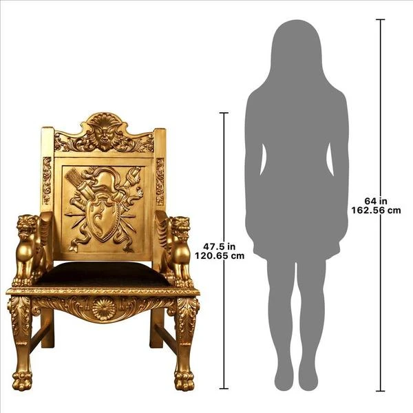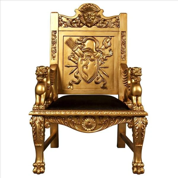 Designed to pay homage to Alfred, King of Wessex, the unifier of Anglo Saxon England, our impressive Design Toscano-exclusive Medieval fantasy chair carries the history of a proud people. A central coat of arms features sword and shield as it anchors the center back. A rich, ebony velvet upholstered seat is fitted atop an ornately hand carved skirt with swagged detail and powerfully arched, lion paw legs. Crowned by a greenman pediment and flanked by sculptural gryphon arm rests, this fine work of mahogany furniture art requires a full week of hand carving before it can be finished in faux gold as an investment to be admired through the ages.