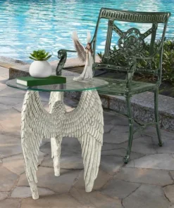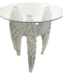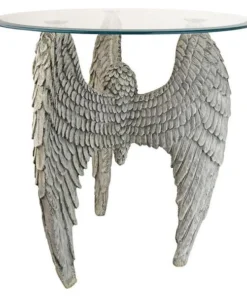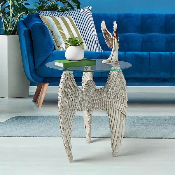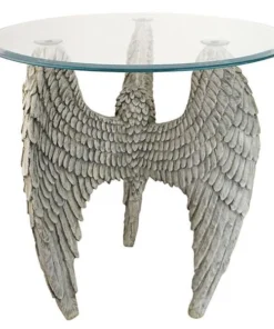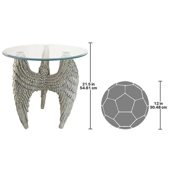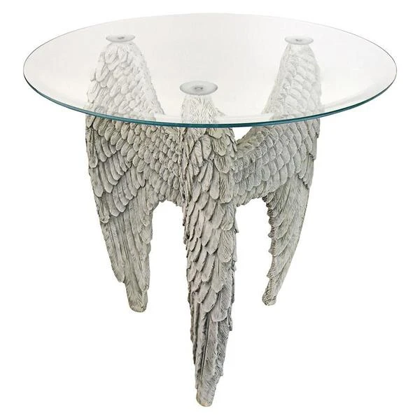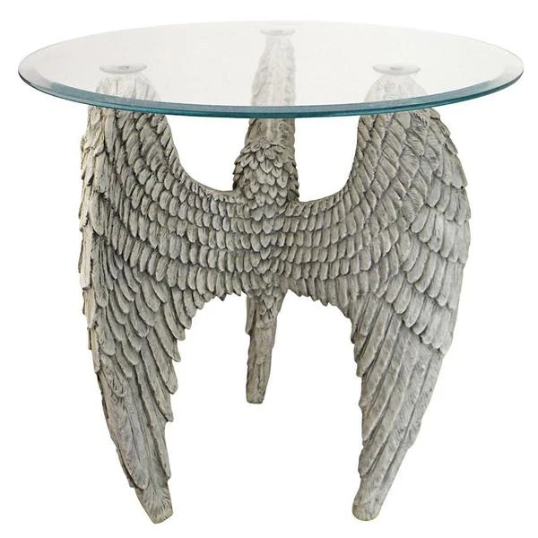 With a decidedly otherworldly quality, a tripod of angel wings forms the angelic fulcrum of this heavenly table. One of the most magical approaches to decorative fantasy art we've seen, our Design Toscano exclusive is sculpted 360-degrees to be admired from all sides before being topped with a 3⁄8"-thick, pencil-edged glass top. Each mythical cherub feather is cast in quality designer resin with a faux stone finish to transform a seemingly light and airy image into a work of furniture art with the ability to stand up to modern usage. This is a truly charming focal point for home or garden! 181⁄2"dia.x211⁄2"H. 9 lbs.