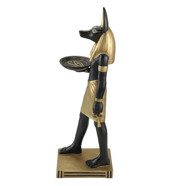 Turn the tables and have the gods serve you! Sculpted ready to hold your keys, cocktail or a book on his tray that boasts hieroglyphs and an Eye of Horus, Anubis the Jackal God of ancient Egypt is ready to serve you at home or in your royal gardens. Our almost yard-tall, Design Toscano-exclusive Egyptian sculpture is cast in quality designer resin and hand painted in a palette of faux ebony and gold to highlight details from his jackal ears to the golden ankh in his hand. This symbol of an Egyptian civilization is a true statement piece! 12" Wx9" Dx351⁄2" H. 14 lbs.