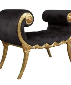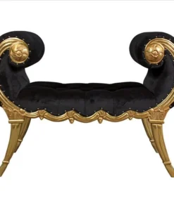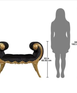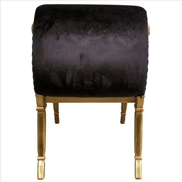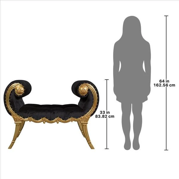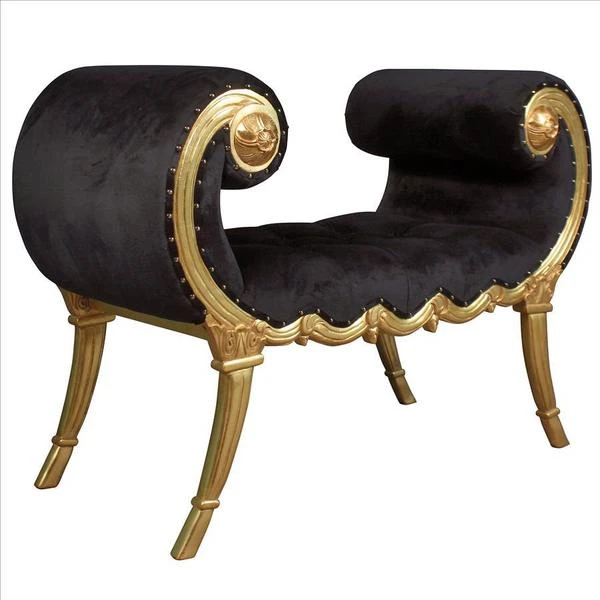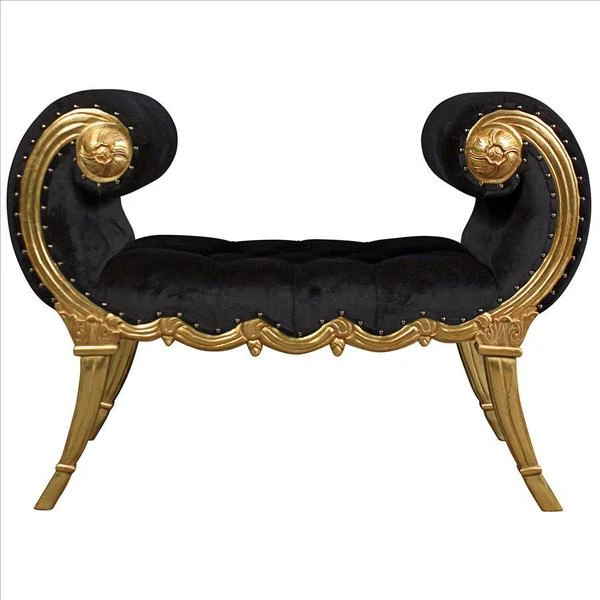 Look at those lines! Reflecting both grace and power, the sexy curve of this Neoclassical bench is an instantly swoon-worthy decorative decor accent. Decidedly feminine, the alluring, crescent scrolled arms give way to a classical swag frame detail that nods toward shapely, stylized saber legs. This functional work of furniture art is crowned with a rich ebony velvet upholstery that beckons one to sink into comfort. Our Design Toscano exclusive is hand carved of solid mahogany with a real gold leaf finish ready to enhance your home with elegance and style.
