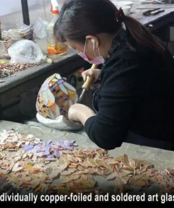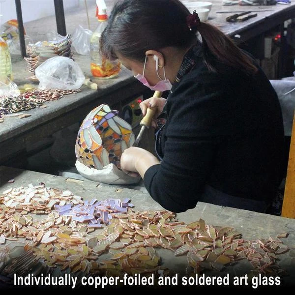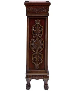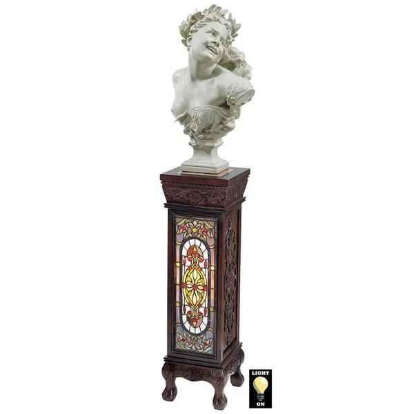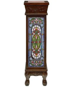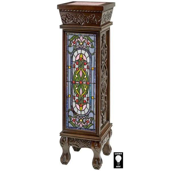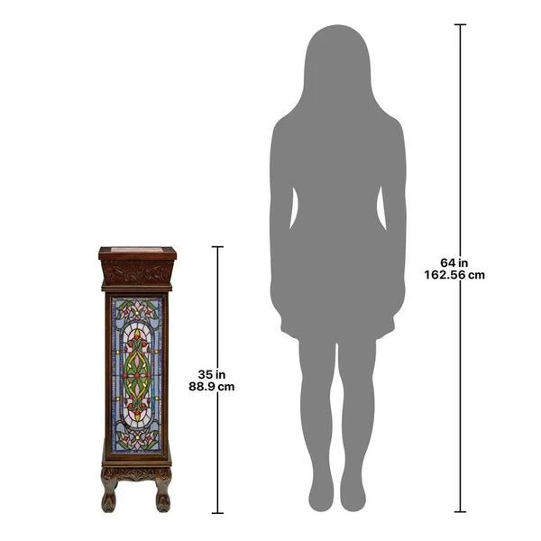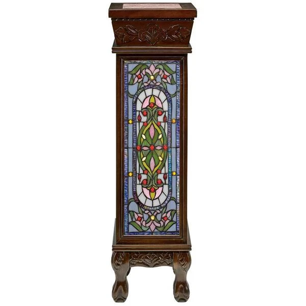 Showcase your favorite statue or greenery with this appealing, almost-yard-tall work of decorative art! As lavish ornamental style, Beaux-Arts, more than any other, represents America s expansive industrial age at the turn of the 19th century. The opulent art glass window is a delight to the eye featuring the high quality art glass that is hand-cut, copper-foiled, and individually soldered. The handsome design boasts a frame within a frame featuring an intricate border all surrounding the center medallion that is highlighted with emerald green and crimson red accents. Three ornately crafted rich dark walnut finished wood panels encase the authentic stained glass masterwork illuminated by a warm glow from a strategically placed 16-watt bulb within. Its ball and claw, quality designer resin feet rise toward a variegated, rose, solid natural marble inlay top. Switch on cord. 10 Wx10 Dx35 H. 21 lbs.