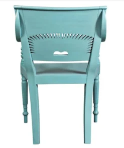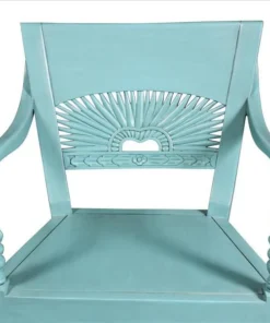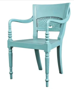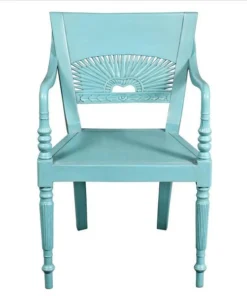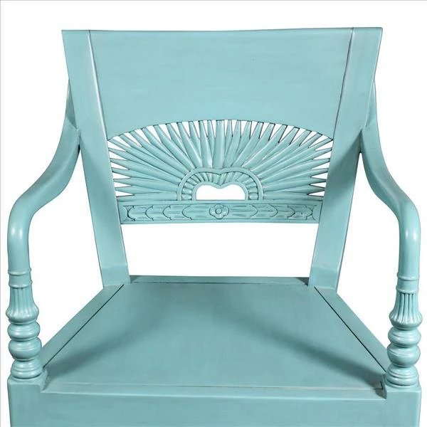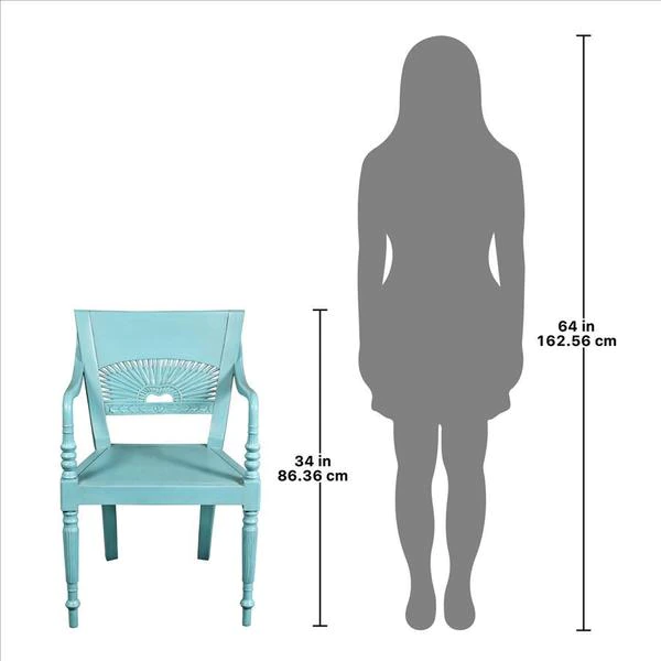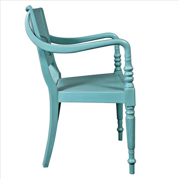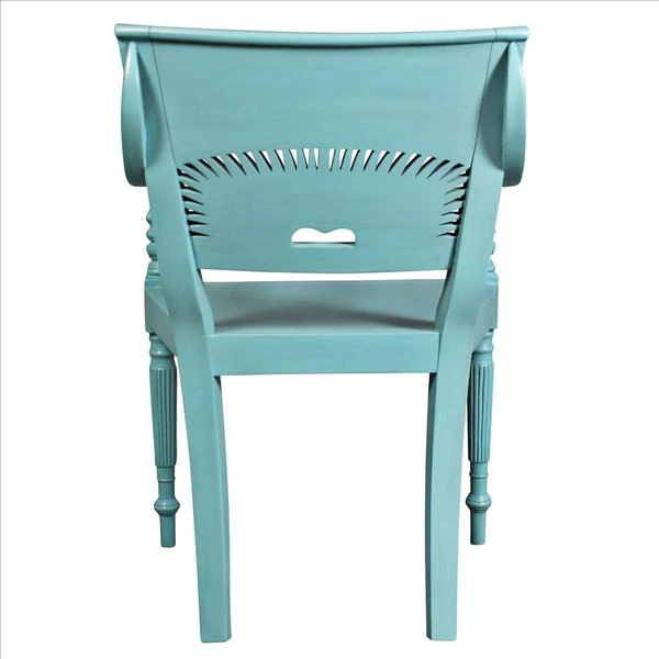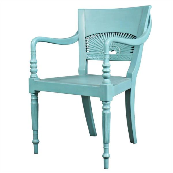 Beneath fans of palm fronds, chairs like these sat across the expansive, tropical verandas of gin and tonic-drinking, late 19th century British colonial aristocracy. The eye is drawn toward the glamourous, pierced, sunburst center back splat, the carved, turned arm supports and the legs tapering to peg feet. Using a design drawn from the pattern books brought to India by the romantic wayfarers, these antique replicas are recreated in solid mahogany and finished in a shabby chic plantation egg-shell blue as perfectly timeless as its classic design. On a threeseason porch, beneath a covered portico or awning, a pair of these Design Toscano exclusive chairs creates an oasis for rest reminiscent of days gone by.