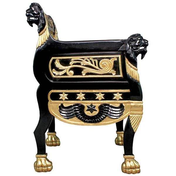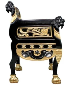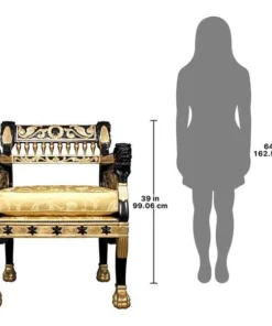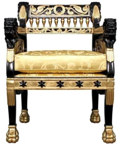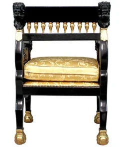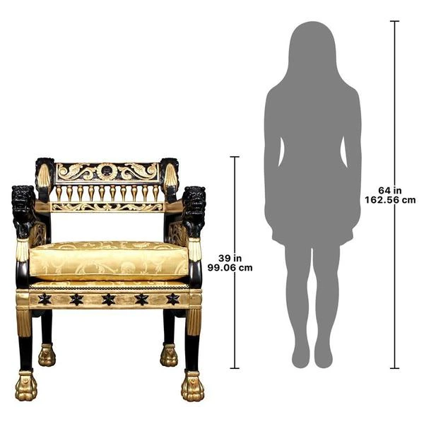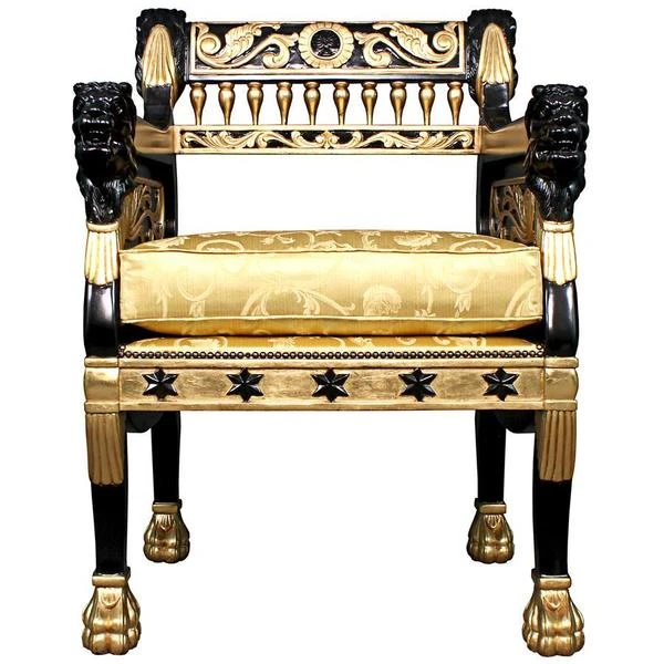 All heads will turn as guests admire the resplendent beauty of this solid hardwood throne chair! Our master carvers captured every detail of the original Thomas Hope Neoclassical antique in solid mahogany, from its stylized lion armrests to its gilded paw feet. Our exclusive chair boasts an ebony finish accented by hand-crafted golden-gilded accents that set off the quality jacquard upholstery. This Design Toscano-exclusive has all the authenticity of a fine period antique. 28"sq.x39"H. 58 lbs.