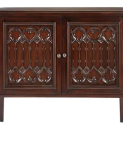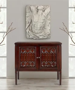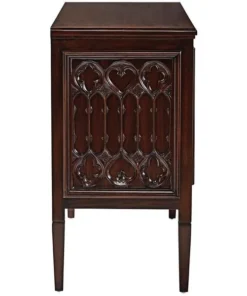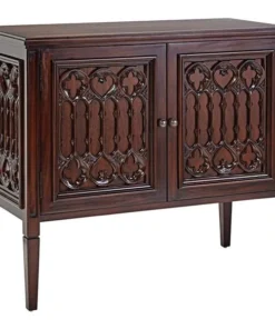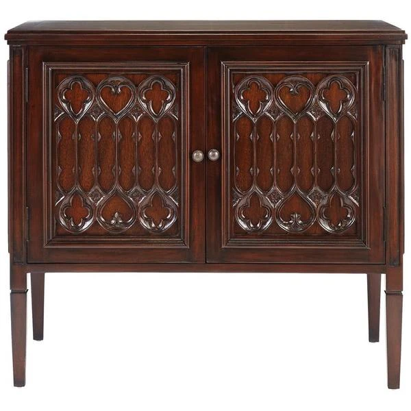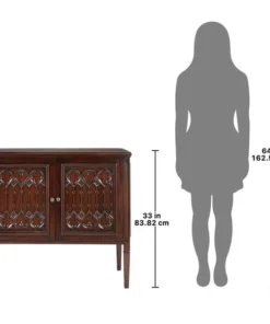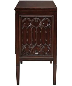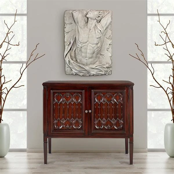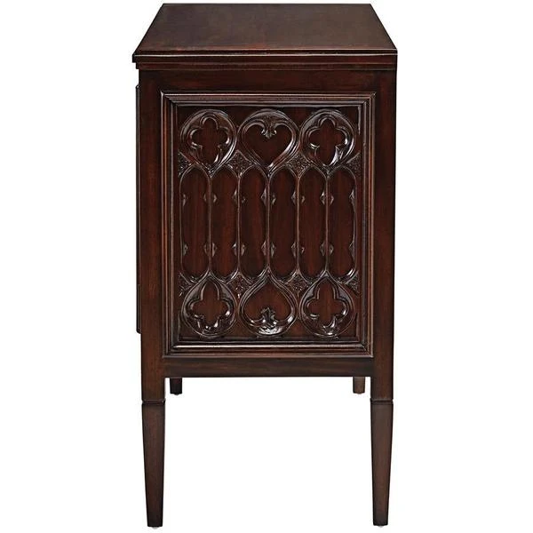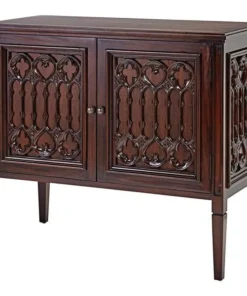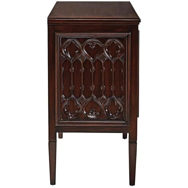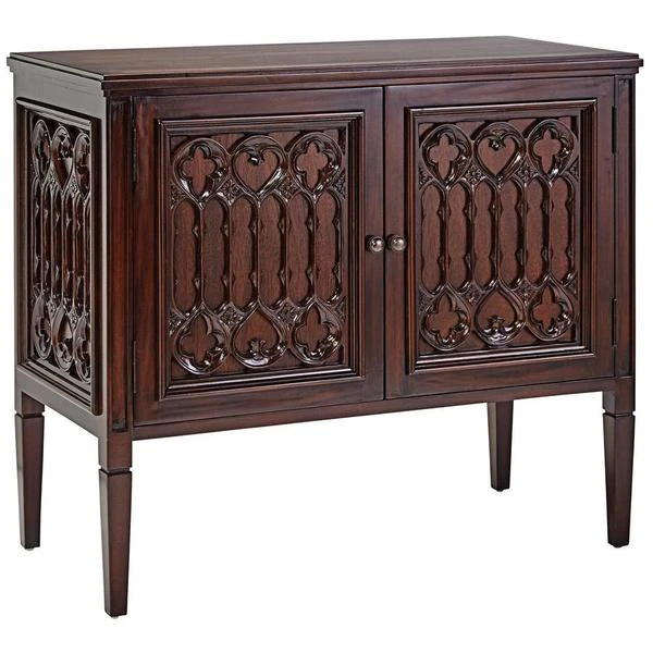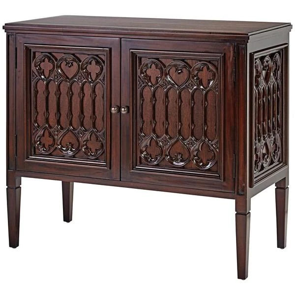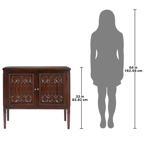 Three sides of this replica 15th century antique replica are wrapped with the elaborate Gothic Revival fretwork that make this piece of decorative furniture art an instant standout! Rising on tapered legs toward double doors with metal handles, this solid mahogany piece with center shelves is as functional as it is beautiful. Whether outfitted to hold your music collection or offering up games and puzzles for the family, this versatile Design Toscano exclusive boasts a hand-rubbed, antique walnut finish to easily meld with your decor. 36'"Wx17"Dx33"H. 66 lbs.
